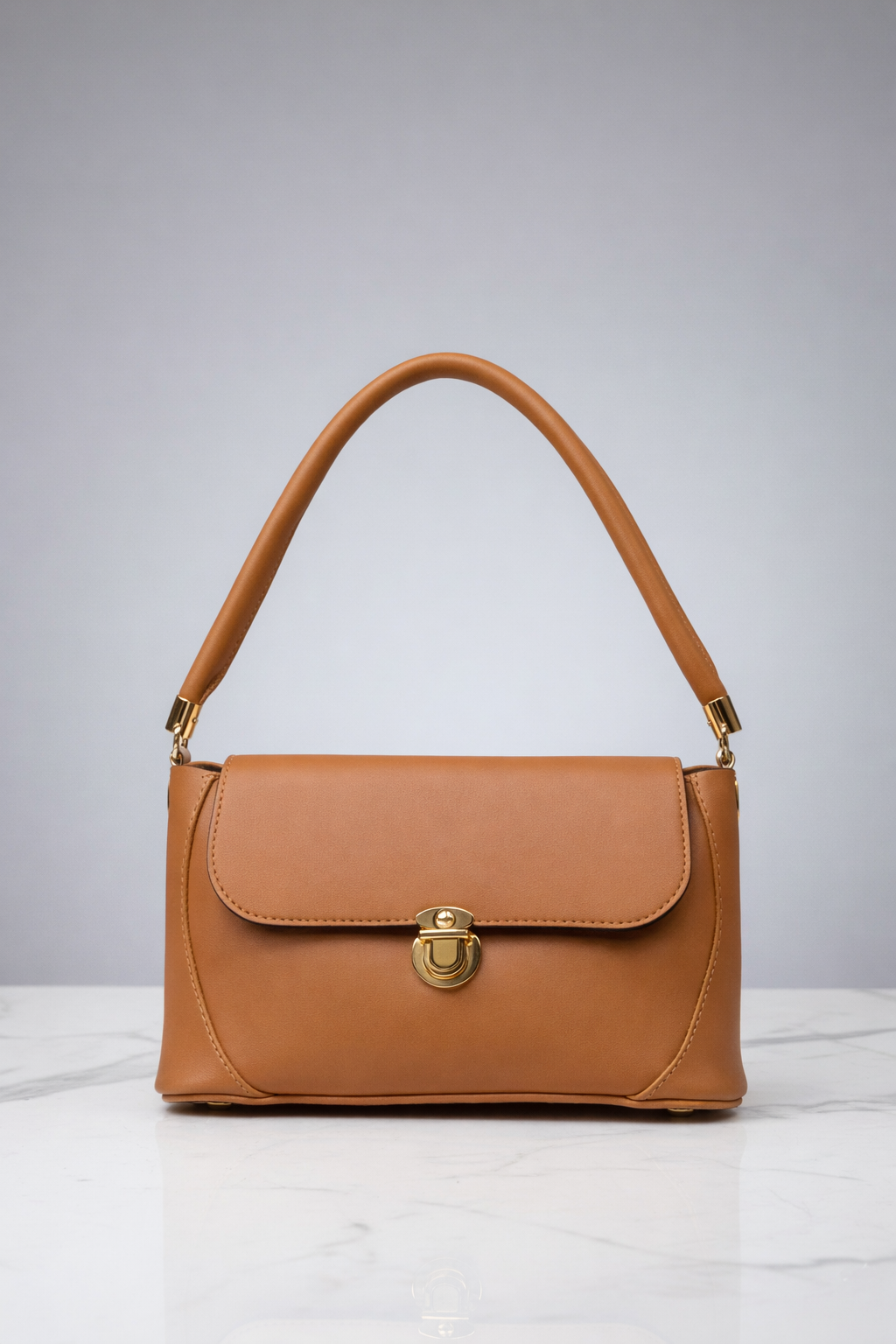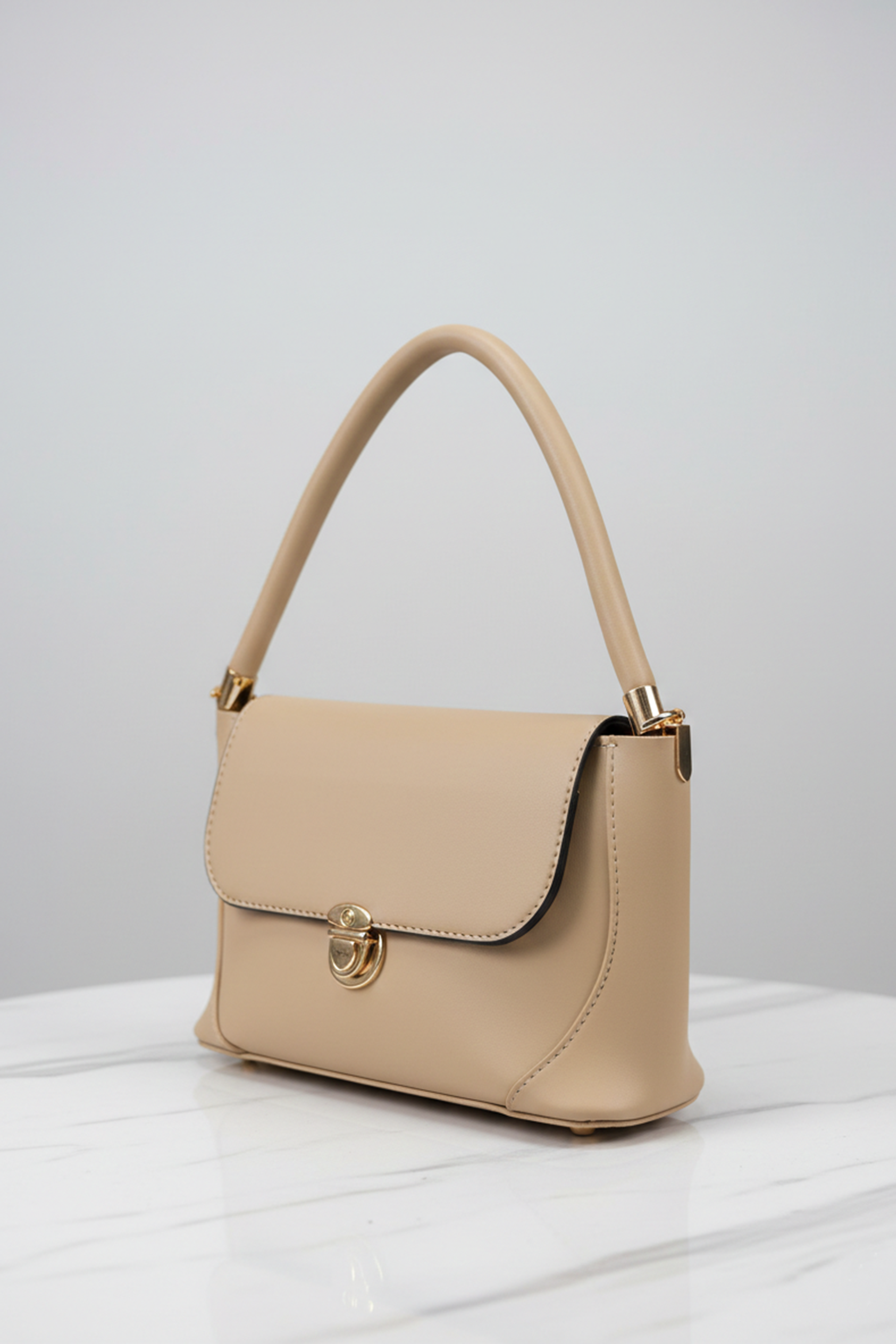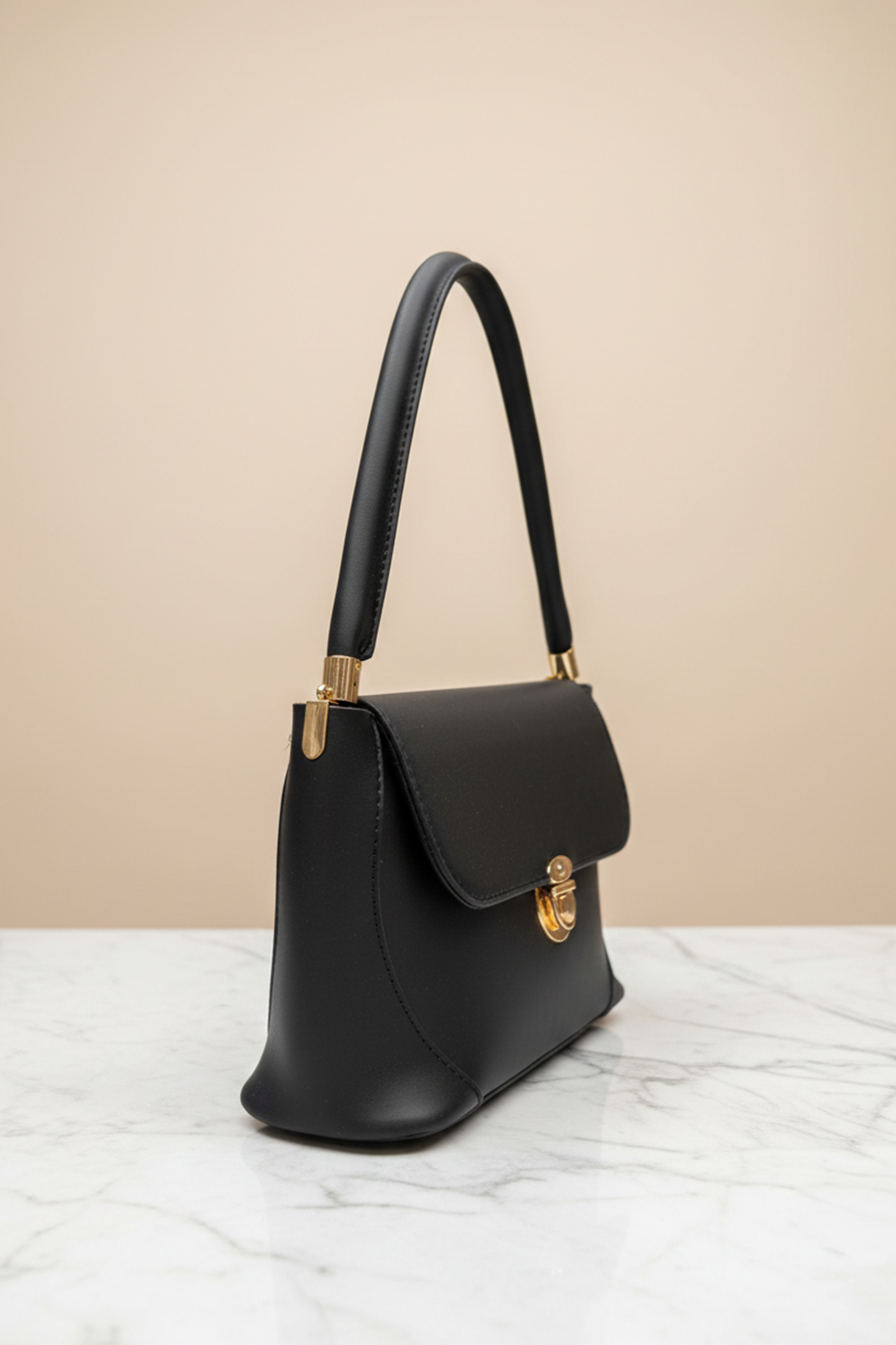 Crafted from smooth, premium vegan leather, it offers a soft yet durable finish that transitions effortlessly from day to evening. The curved top handle adds a graceful touch, while the secure flap closure keeps your essentials neatly tucked away.