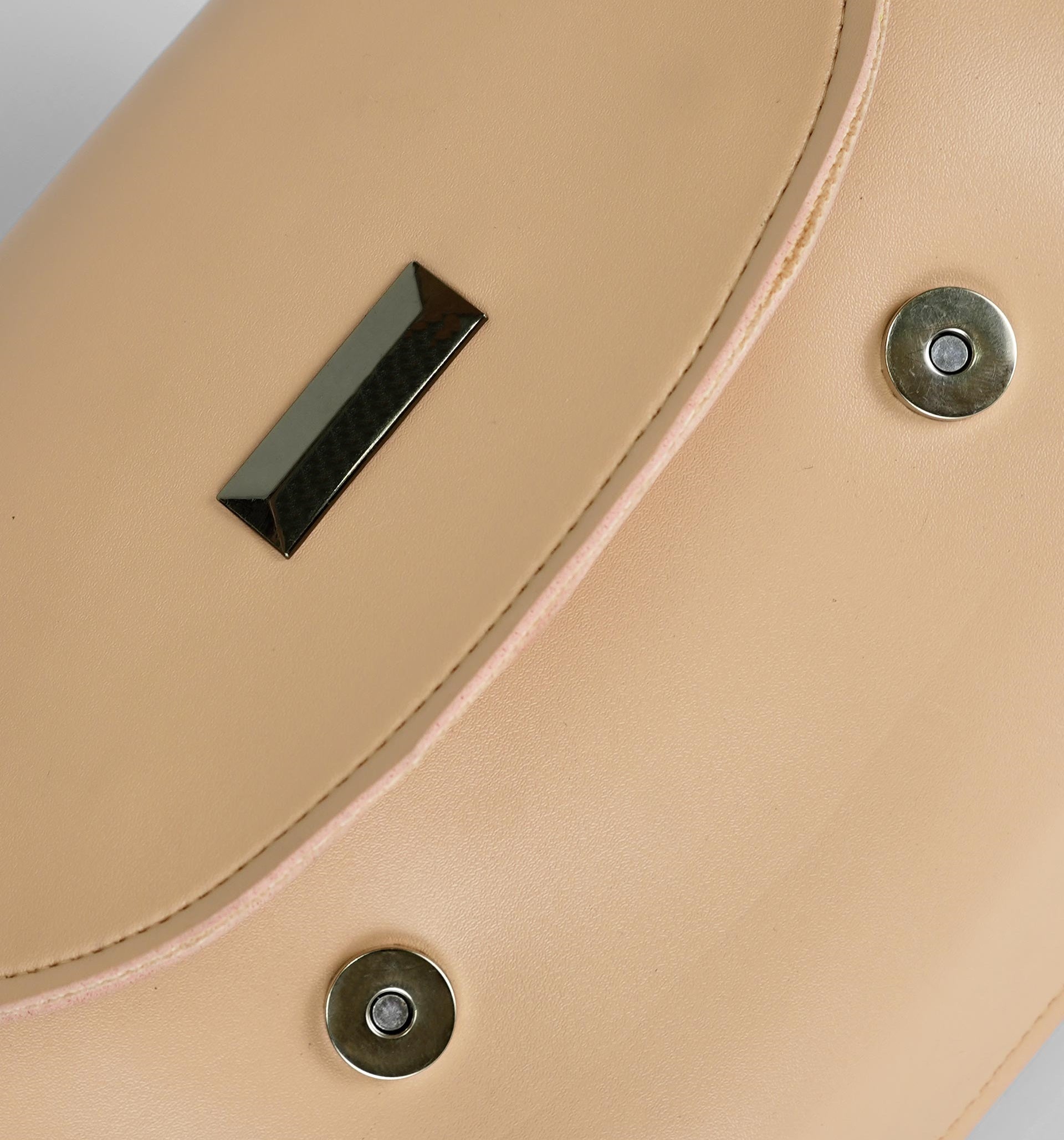 This sleek crossbody bag boasts a clean, modern design with a touch of personality. The curved silhouette creates a flattering semi-circle shape, while the flap opening adds a touch of sophistication. The bag is crafted from smooth leather and features a convenient crossbody strap for hands-free wear.