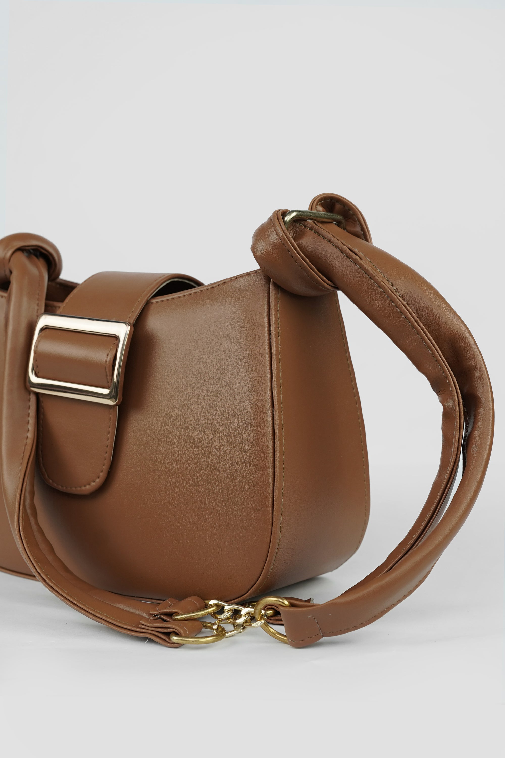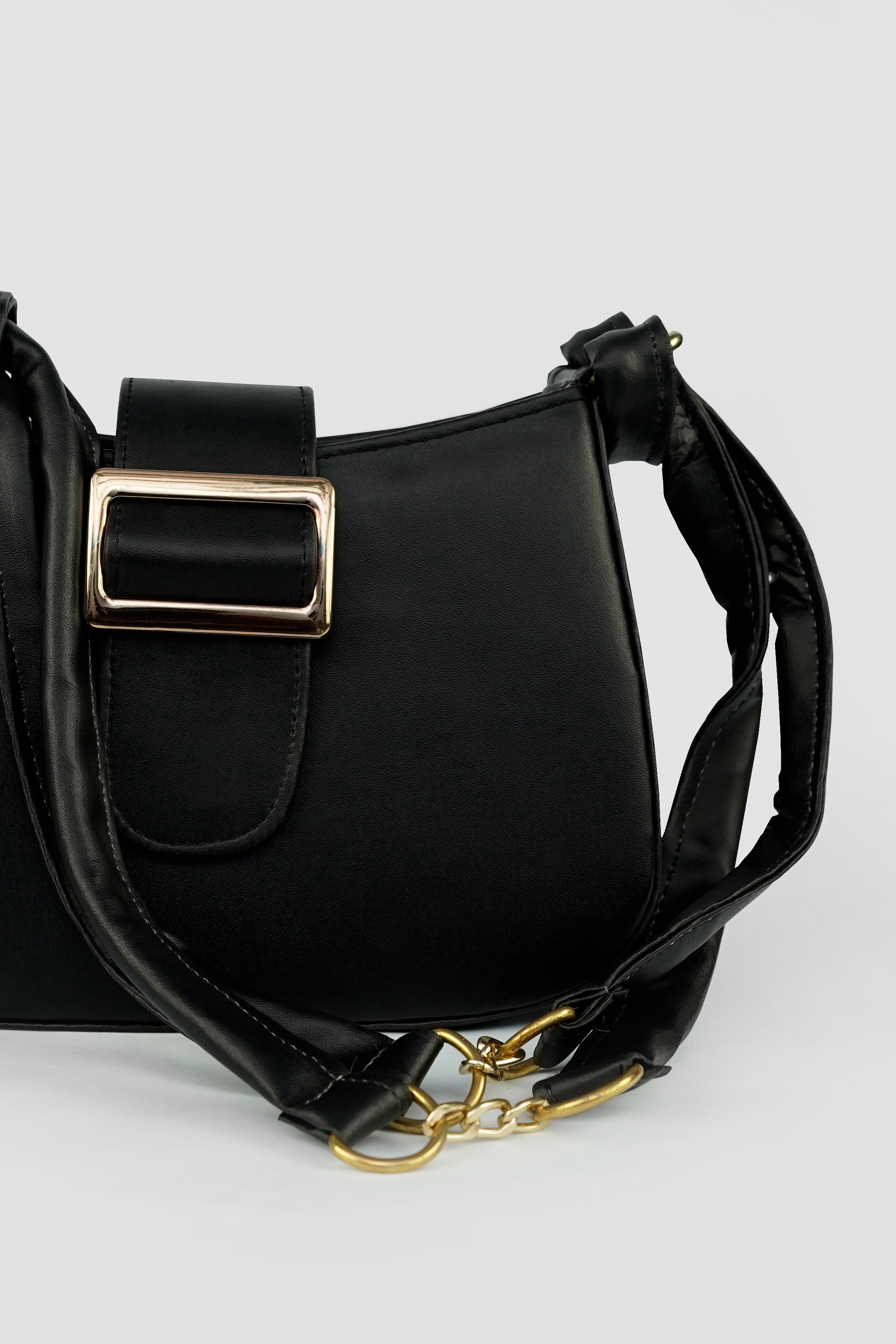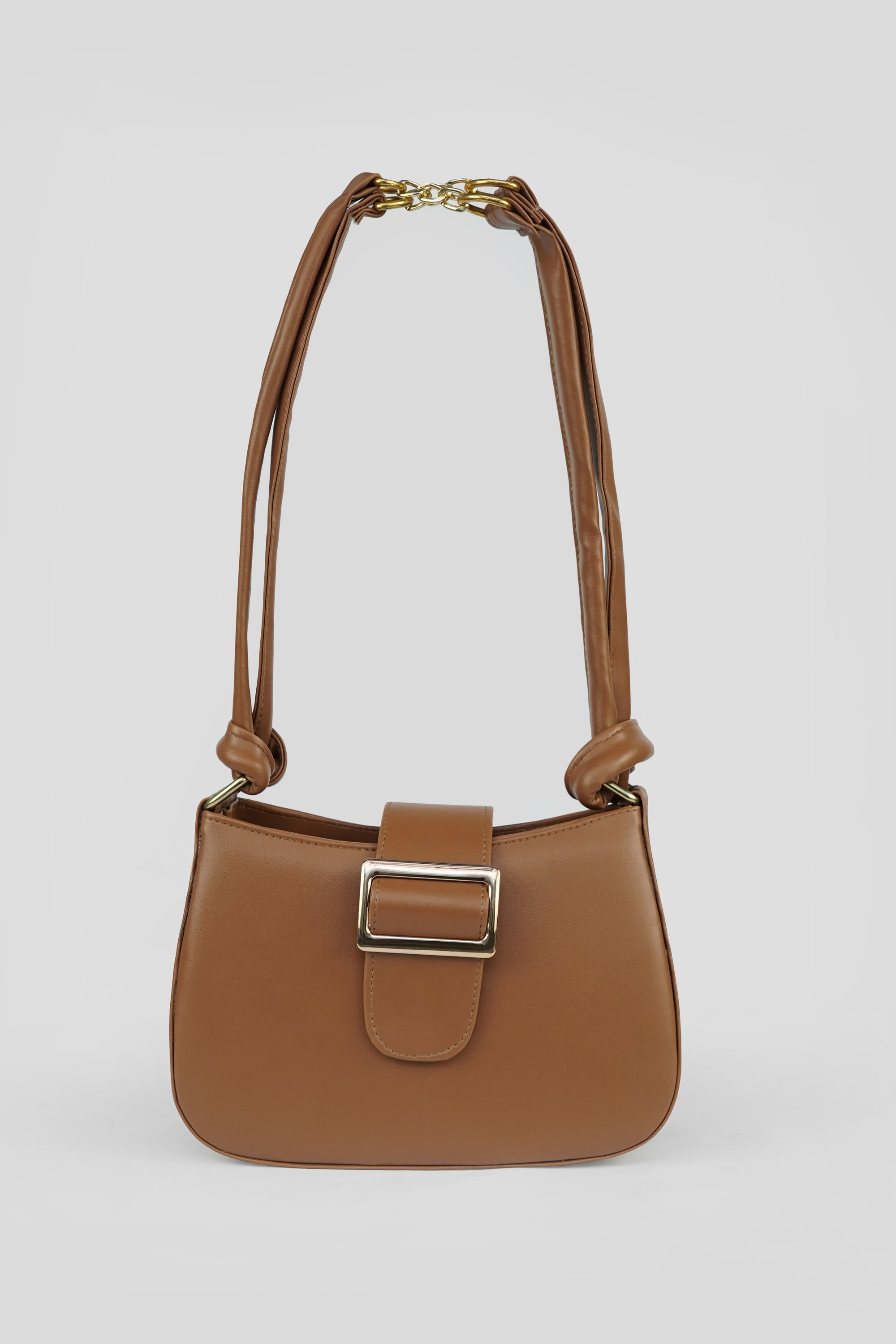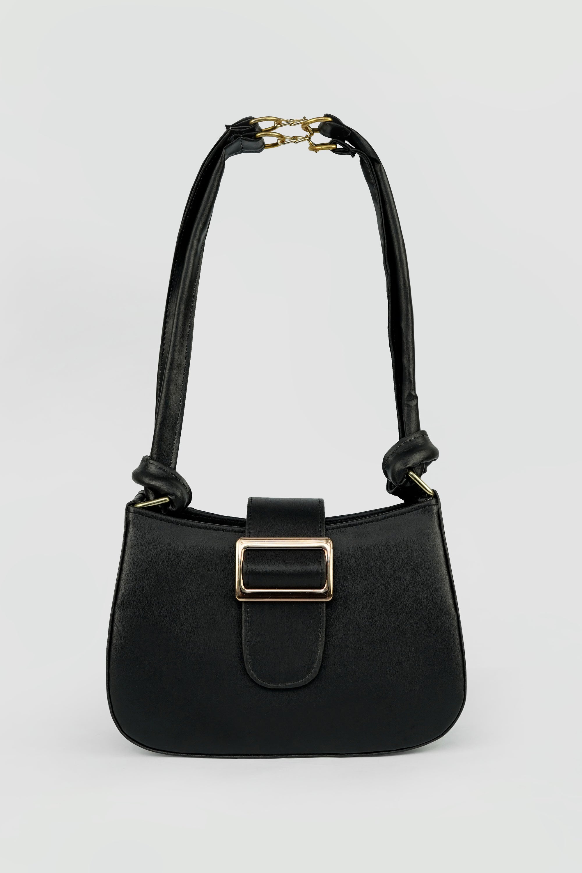 The Elara Buckle is a celebration of understated luxury — crafted in smooth vegan leather, it features a structured silhouette complemented by a bold gold-tone buckle. The soft double-strap handle with a signature chain link detail adds a modern twist to classic elegance.