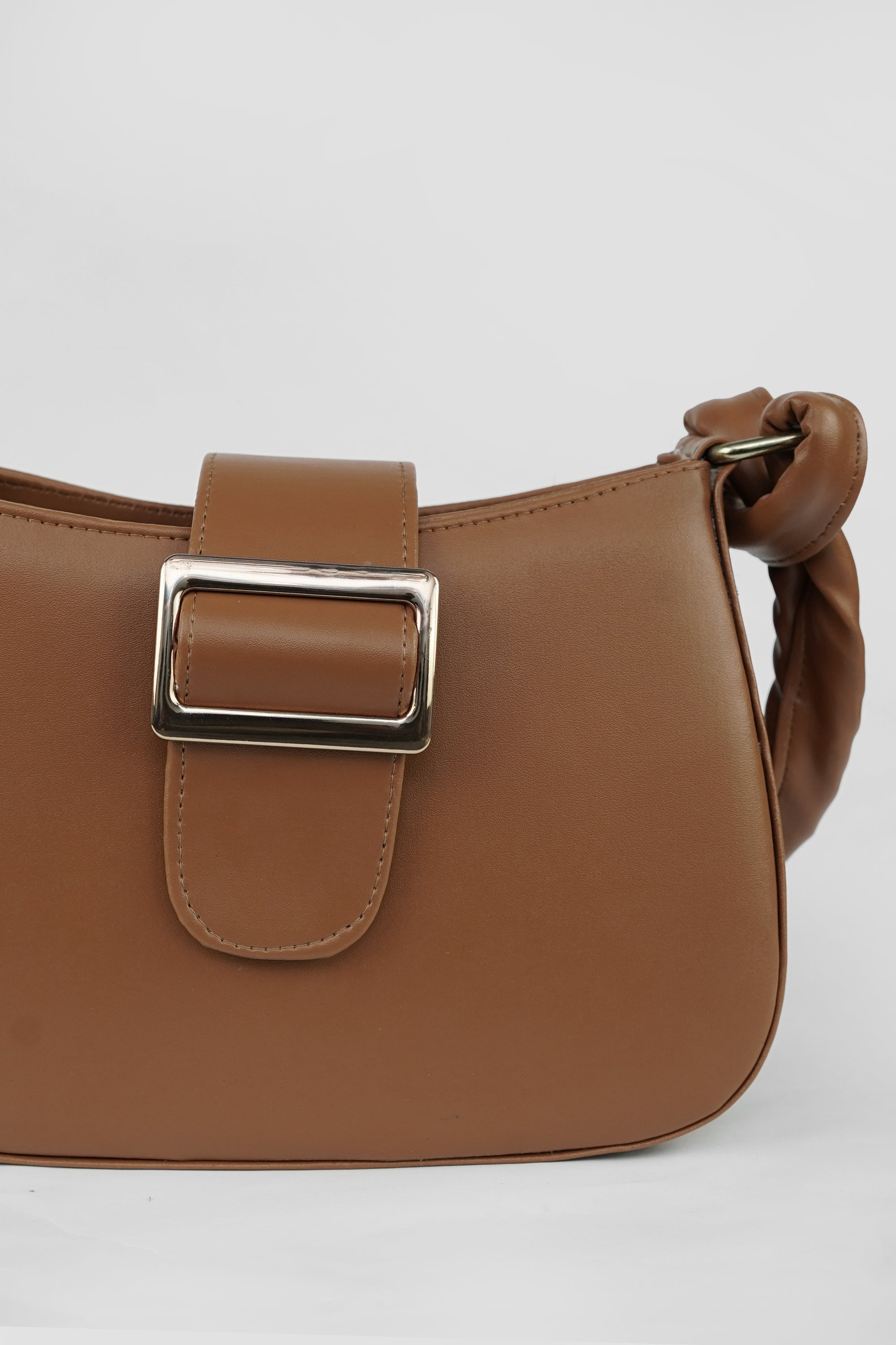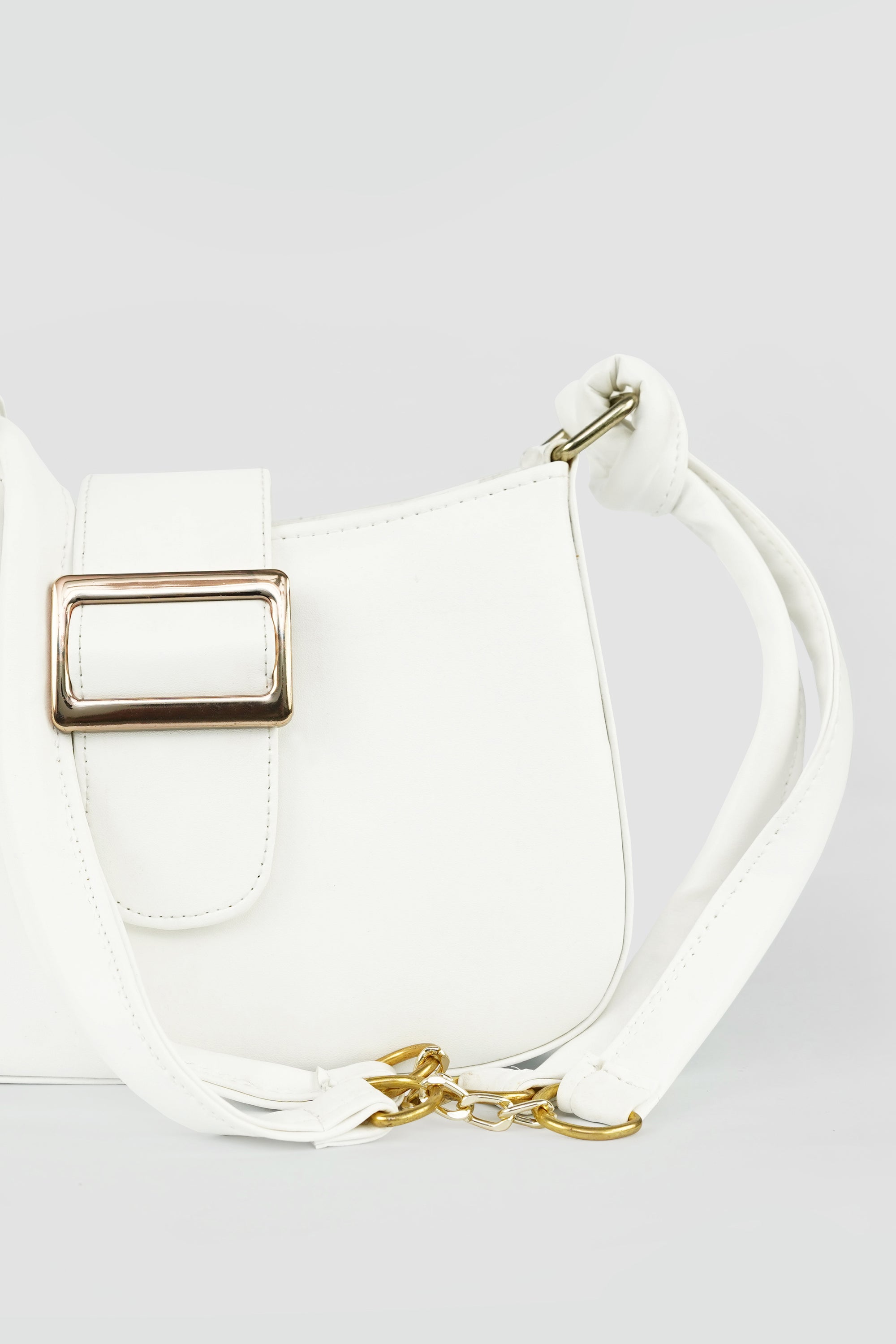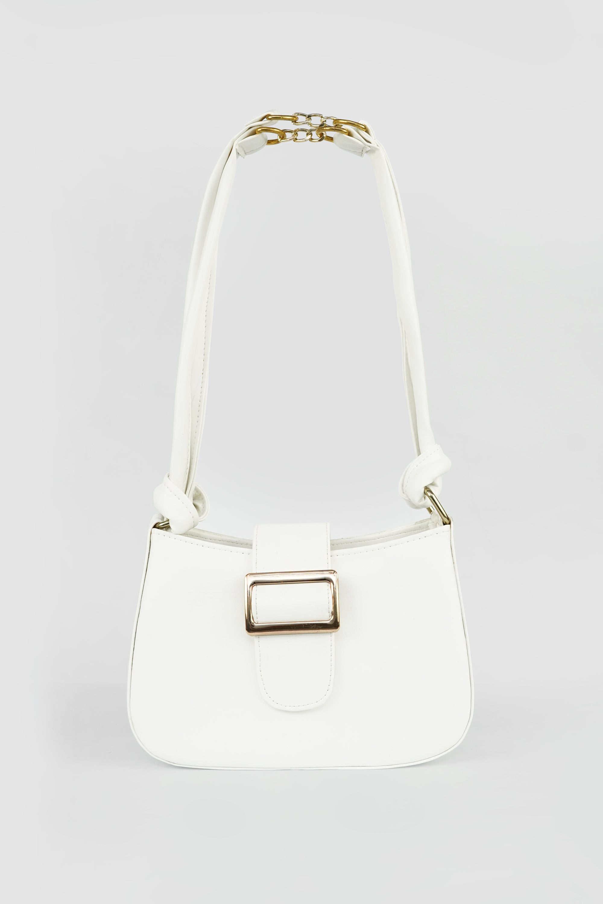 The Elara Buckle is a celebration of understated luxury — crafted in smooth vegan leather, it features a structured silhouette complemented by a bold gold-tone buckle. The soft double-strap handle with a signature chain link detail adds a modern twist to classic elegance.