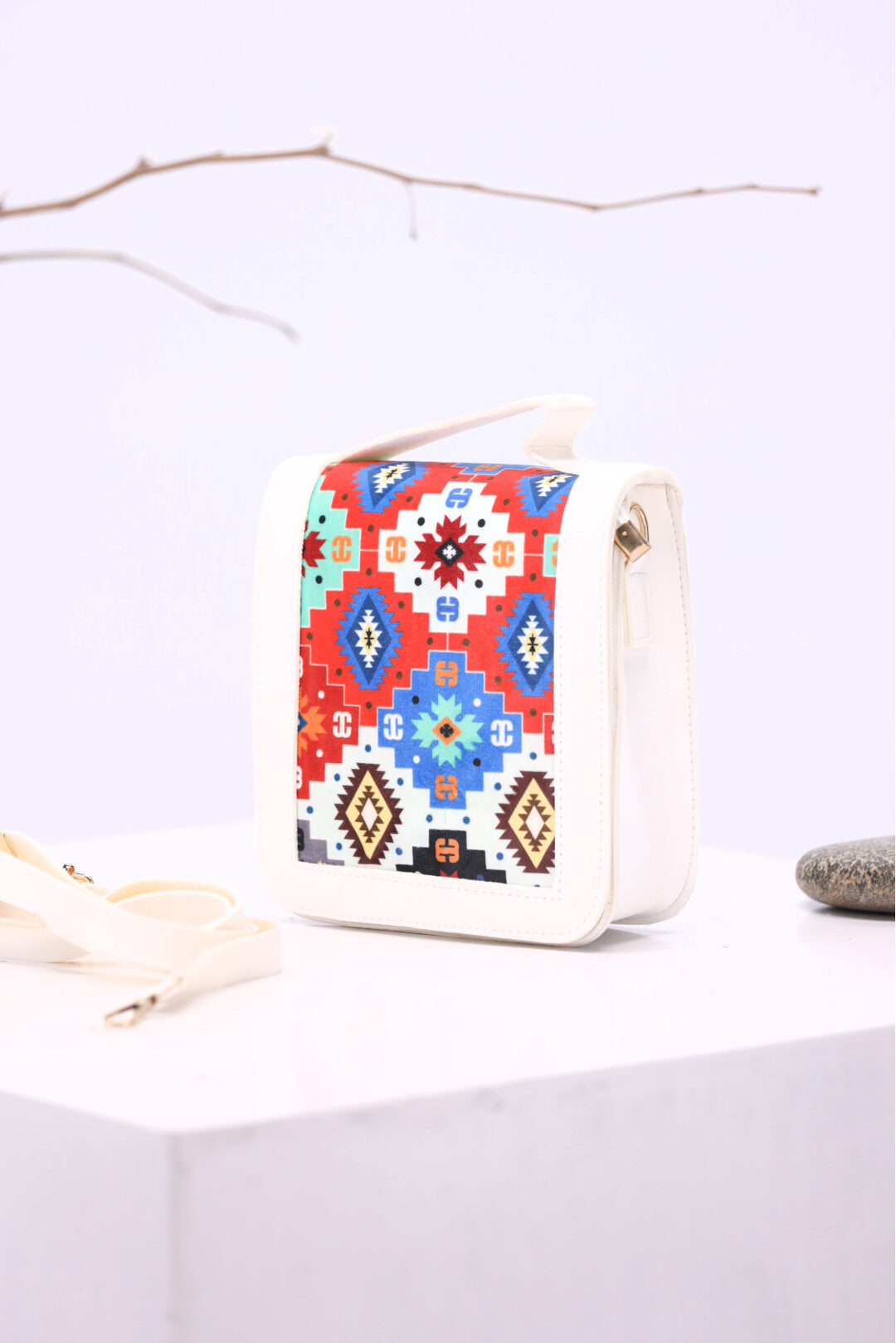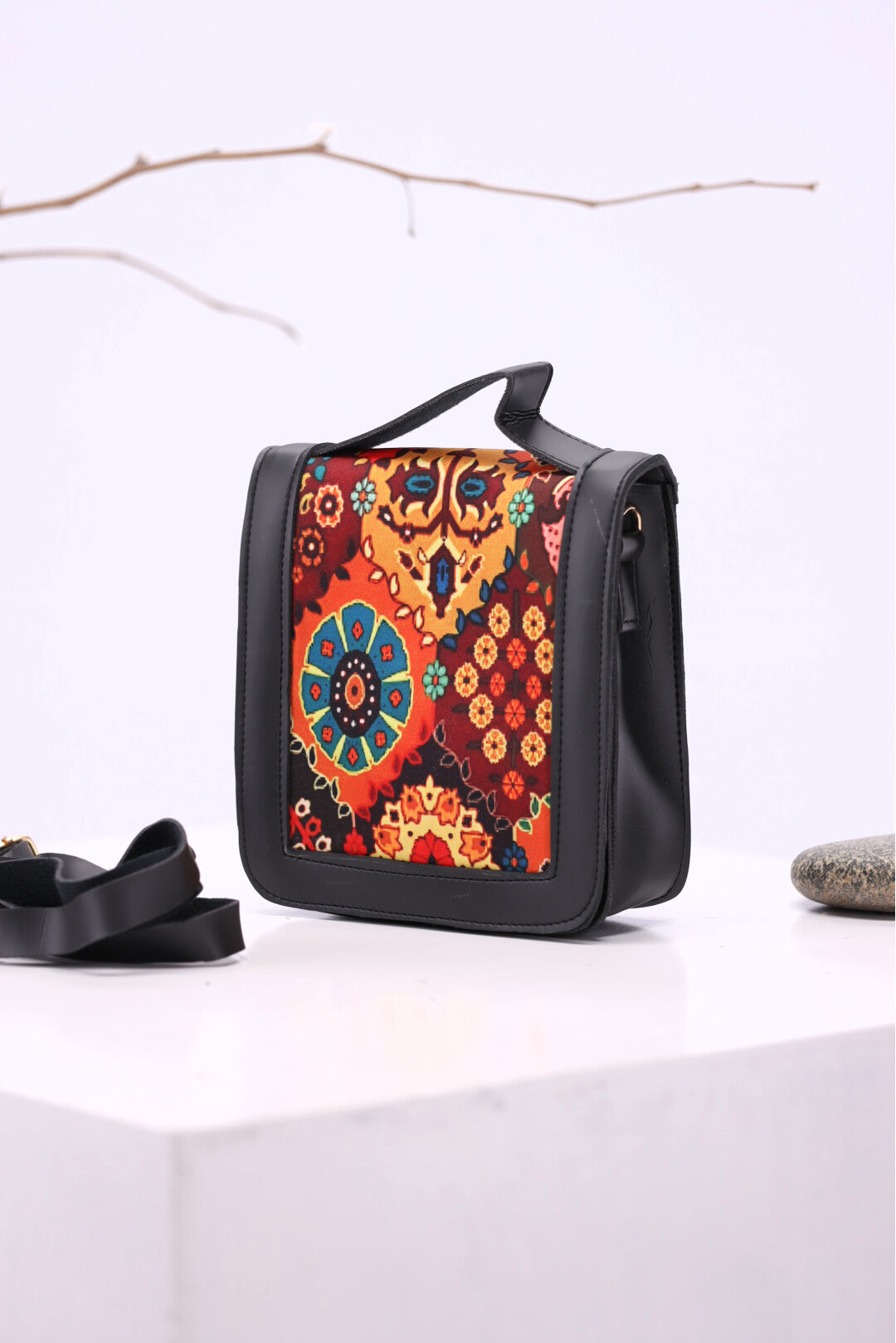 This is a medium-sized crossbody bag with a rectangular shape and a structured silhouette. It has a single, adjustable shoulder strap and a flap top closure with a decorative bow detail.