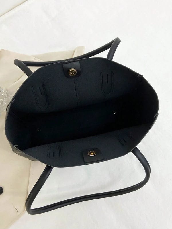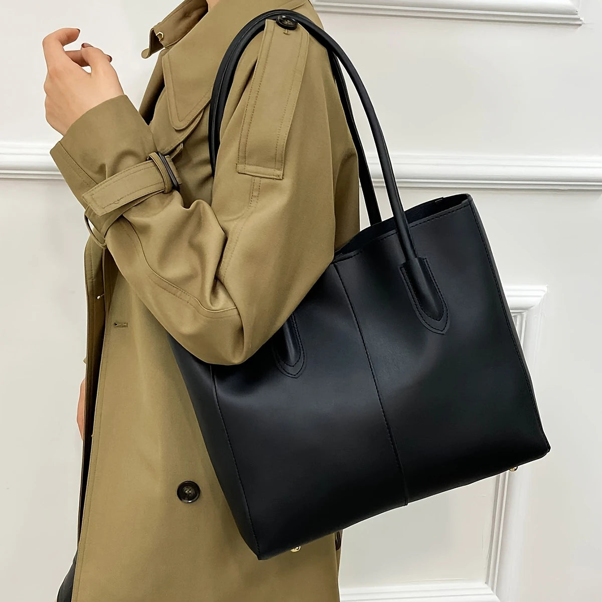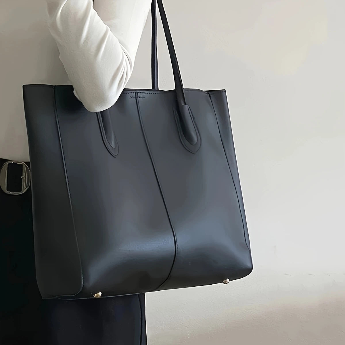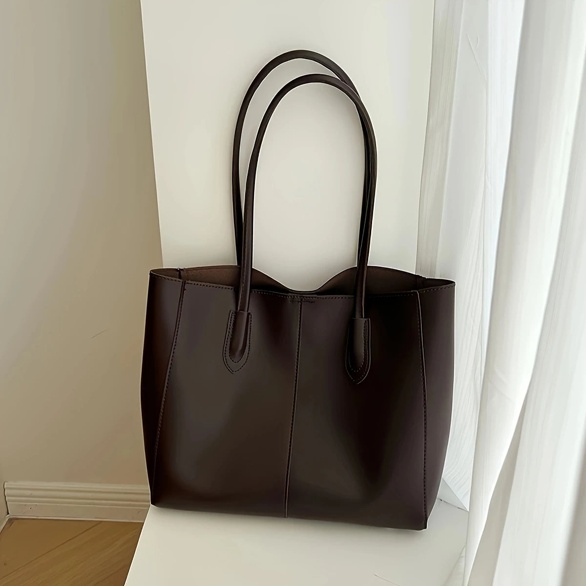 This minimalist tote bag offers a sleek and sophisticated design. Its clean lines and structured silhouette make it a versatile accessory for everyday use or more polished occasions. The spacious interior provides ample room for your belongings, while the comfortable shoulder straps allow for easy carrying. This timeless tote is a practical and stylish addition to any wardrobe.